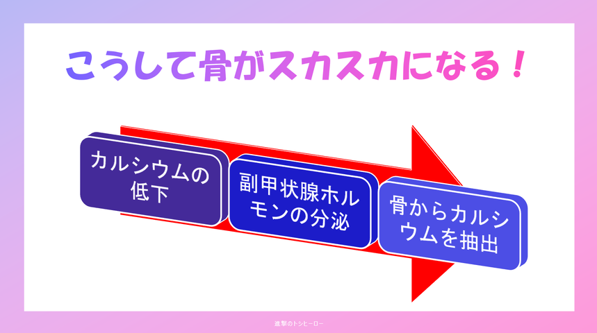 カルシウムは低くなり過ぎると、骨からカルシウムを取って代用するということが起き、骨がスカスカになります。