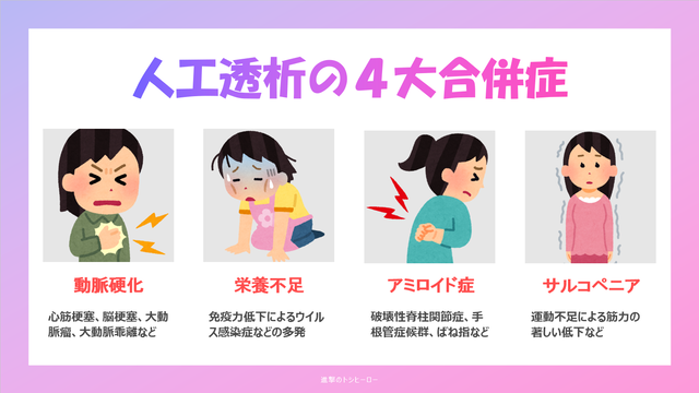 ただし、長く透析を受け続けることで、確率を上げてしまう合併症ばかりですので、その症状と対処法を詳しく知っておくことは重要です。